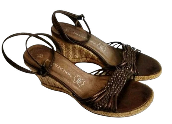 Jolies sandales compensées pour femme, pointure 37,en cuir synthétique marron doré.